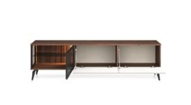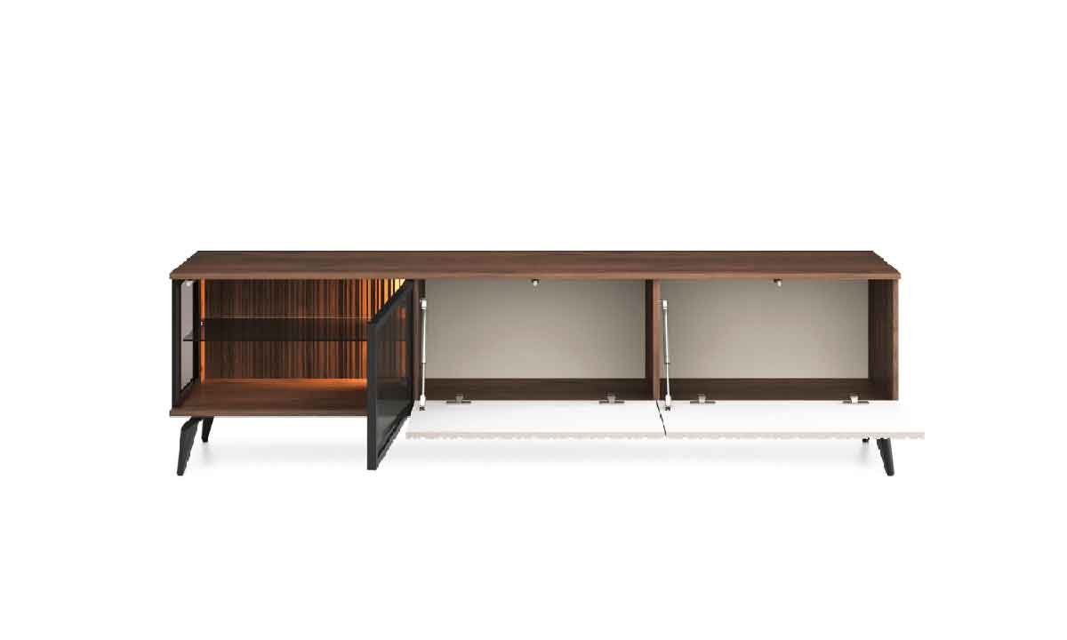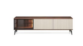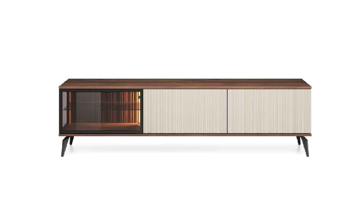 TV komoda VICI RTV180 ima moderan dizajn s funkcijom pozadinskog osvjetljenja i visokokvalitetnim materijalima, što mu daje eleganciju i jednostavnost. Izrađen od laminirane iverice i MDF-a u kombinaciji boja oraha i kašmira, nadopunjen LED rasvjetom u toploj nijansi i funkcijom otvaranja Push-to-Open. Metalne crne noge daju mu stabilnost.